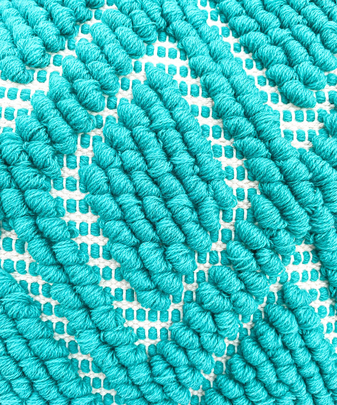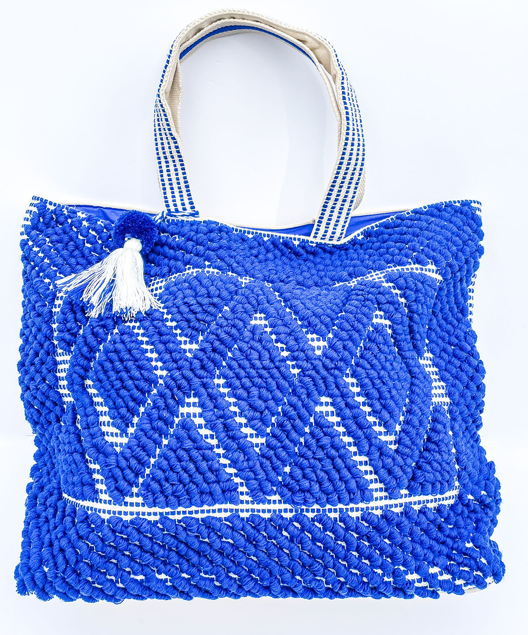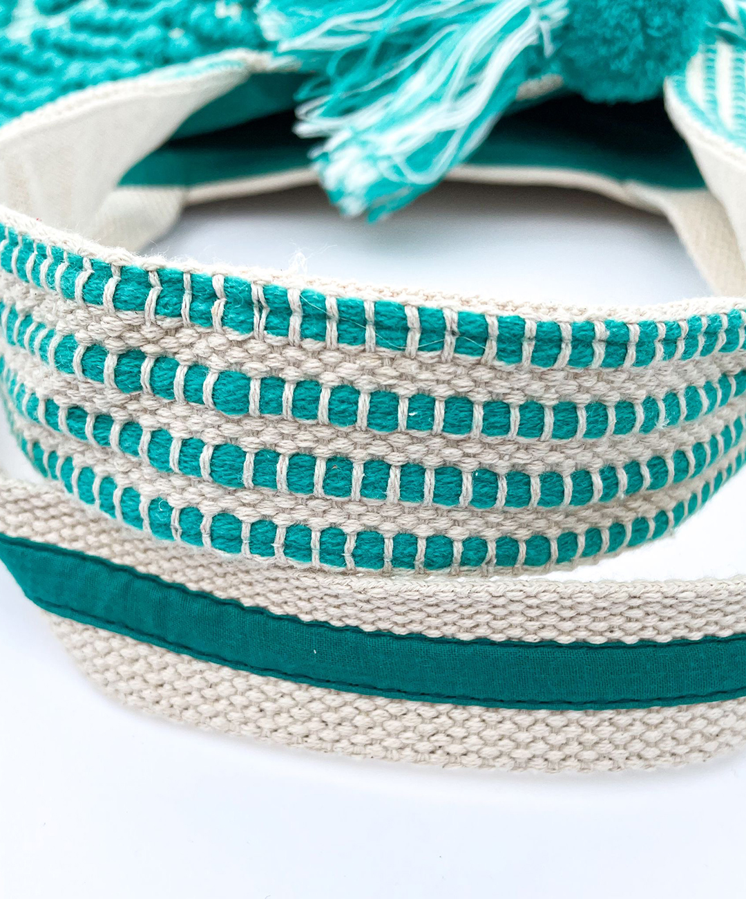 Bolso de grandes dimensiones cuyo tejido está fabricado en 100% algodón en un vivo azul índigo-verde esmeralda.