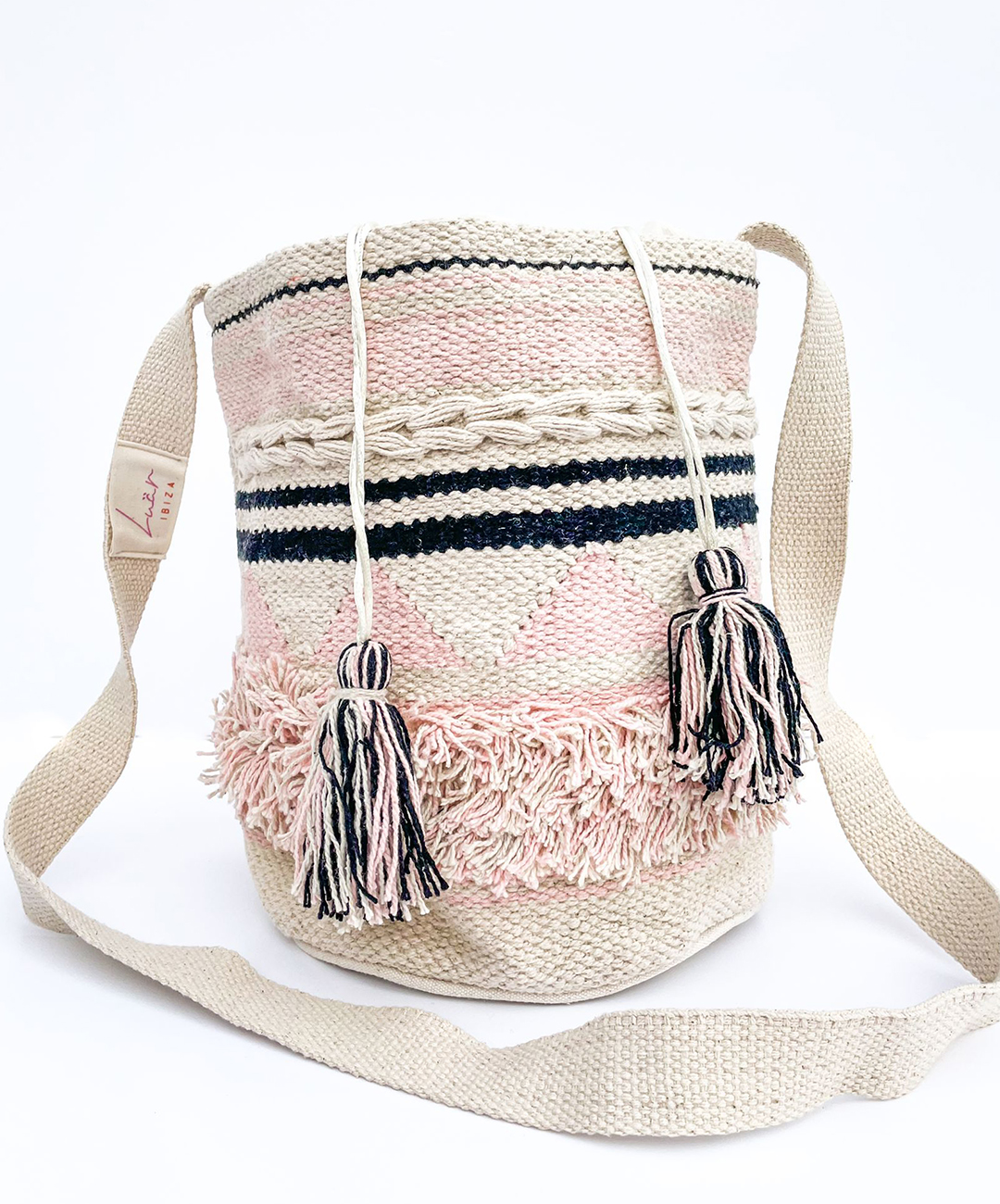 Bolso bandolera en formato saco,fabricado en 100% algodón con un sencillo diseño geométrico
